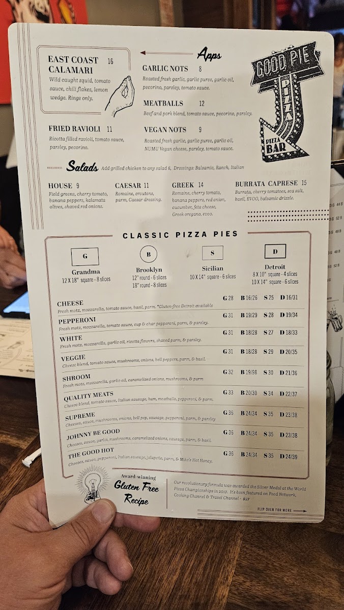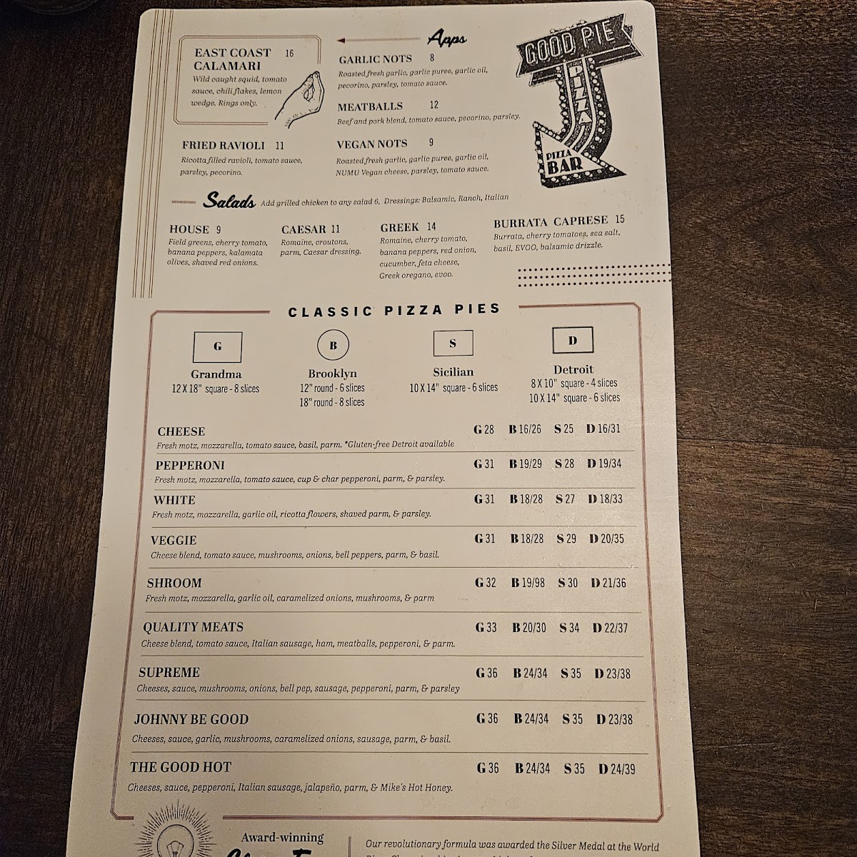 Your dining experience at Good Pie is enhanced by a well-rounded bar program that complements the cuisine beautifully. The lively atmosphere, enriched by an open kitchen where you can see the magic happen, creates a warm environment that feels like home, even thousands of miles away. Whether you're visiting for a casual bite or a special occasion, guests like D T appreciate the attentive service combined with fantastic food and drinks at reasonable prices.